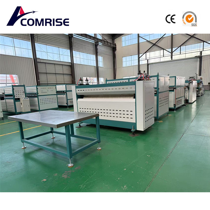 Įtaisytas lapas patenka į traukos ritininį įtaisą ir ištraukiamas vienodu greičiu, o anti-slydimo modelį sinchroniškai paspaudžiamas dvipusis reljefinis volas. „Skraidymo pjūklo“ pjovimo sistema įgyvendina fiksuoto ilgio pjovimą, remdamasis fotoelektrinio aptikimo signalu, o sukravimo robotas užbaigia automatinį gatavų produktų sukravimą. Smulkintuvus perdirbo smulkintuvas ir vėl įdedami į maišymo sistemą, kad būtų galima naudoti uždaros ciklo medžiagų panaudojimą.